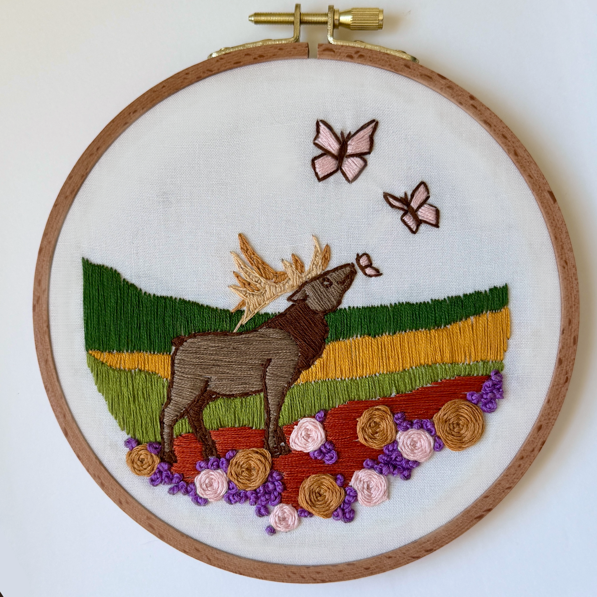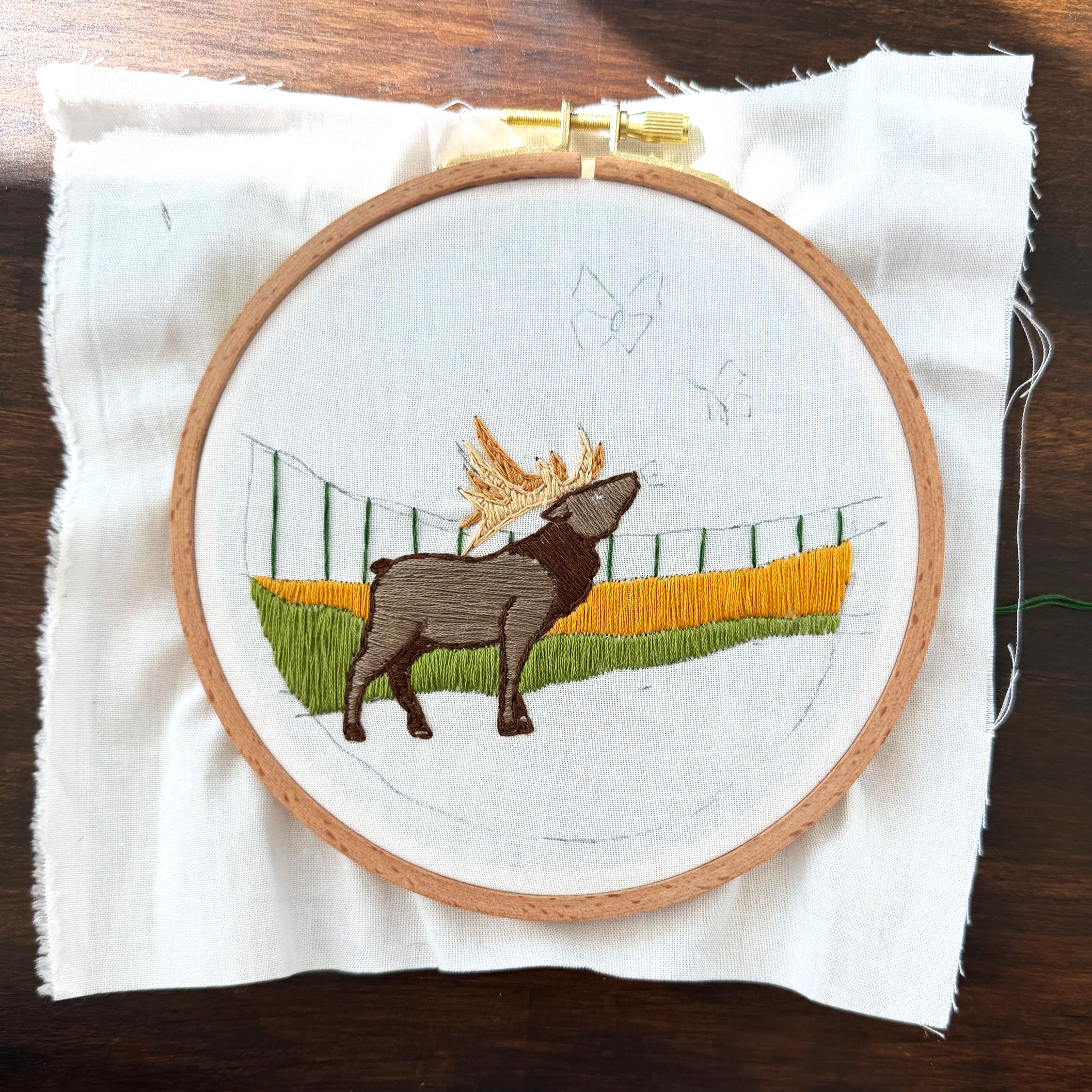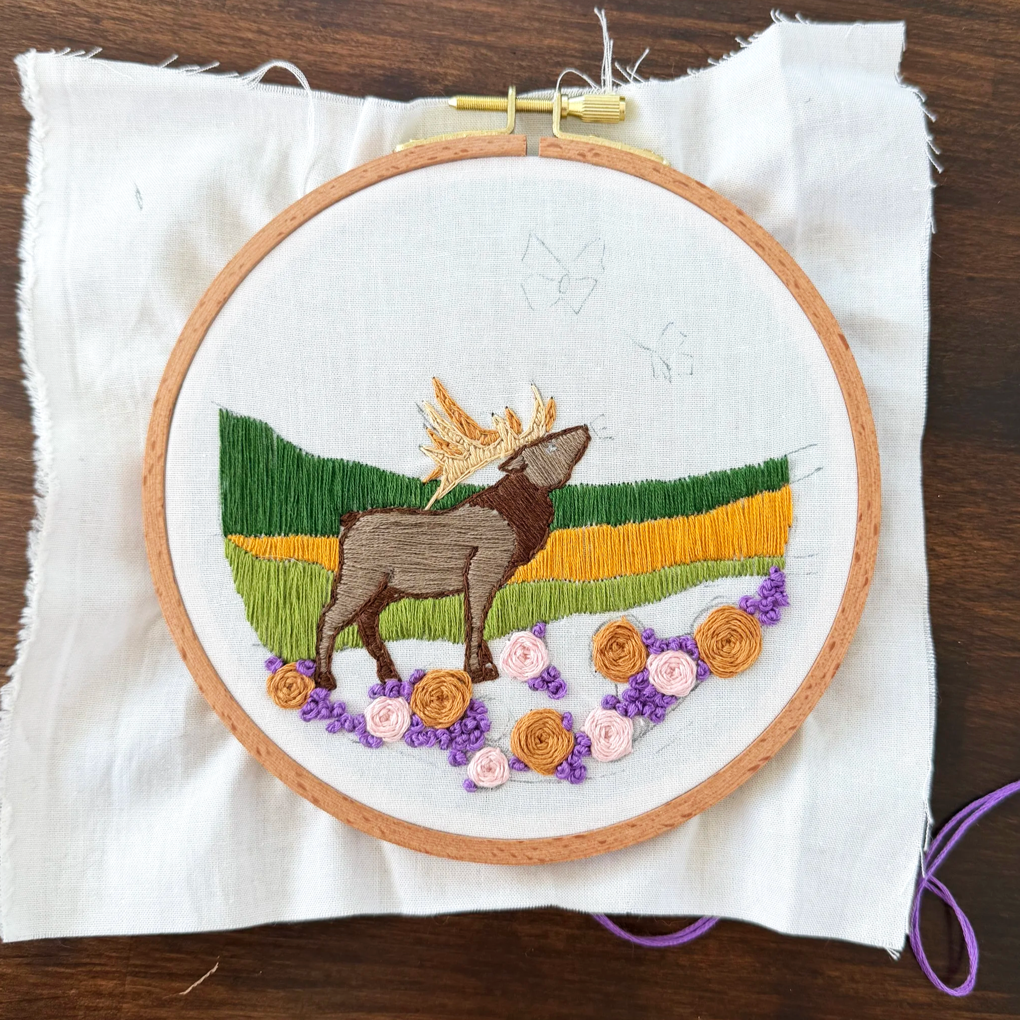 Fill in the elk using satin stitch first before outlining it using split stitch.