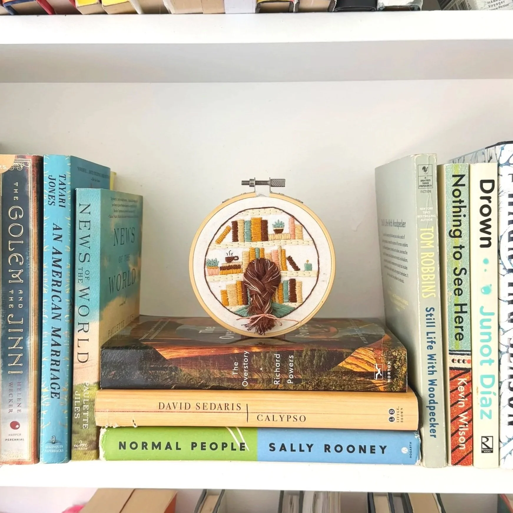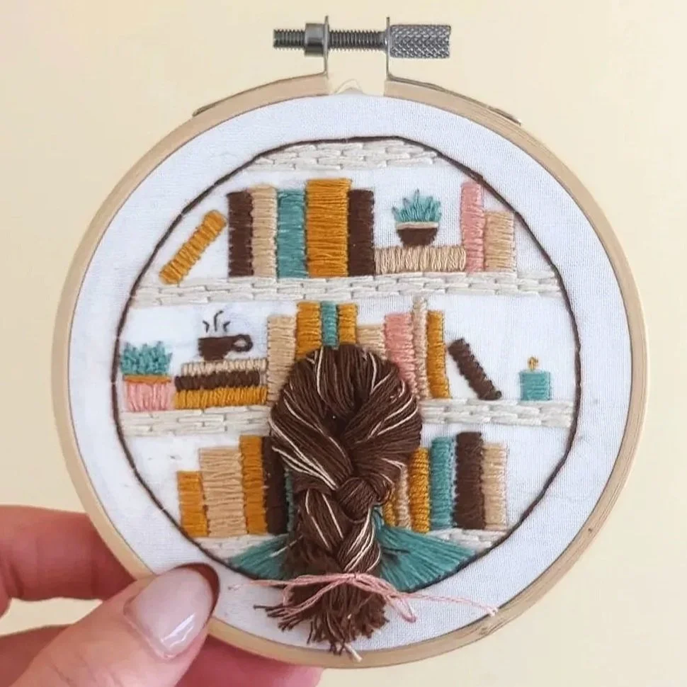 Use 3 strands of any color to stitch a handful of books using satin stitch. It’s recommended to do this the short width of the spines rather than the longer length as it looks a bit tidier.
